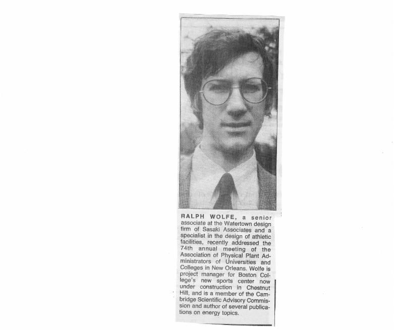 Ralph was a natural born leader and brought this to his work as an architect. He always struggled to balance work and life and this may have held him back somewhat, but it was a compromise he was willing to make. He nonetheless accomplished much in his professional life including his various architectural projects, starting up the sports facilities department at Sasaki Associates and 2 published books, Pole-Building Construction and Home Energy for the 80s. He was an early advocate of alternative energy reflected in these books as well as other published articles and presentations he gave. He was also working on a book on Sports Facilities design when he died. His favorite architectural project was probably the Gosman Center, sports facility at Brandeis University where the Boston Celtics practiced from 1991 to 1999. This project came in on time and under budget with happy clients---something that seems to be a rarity in the world of architecture. I took the picture below at the Brandeis facility when visiting with Jack. It is a memorial to Ralph and his work on the project hanging in the entrance to the building.